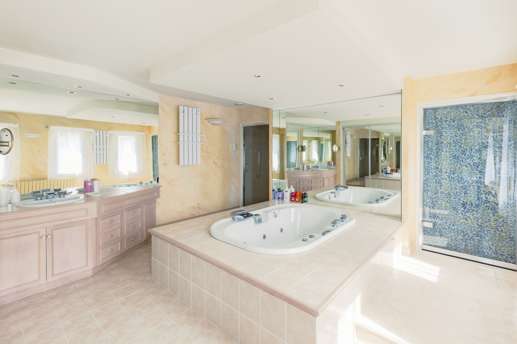 Superbe salle de bain avec baignoire balnéo, douche à jets, WC privatifs et attenants pour un confort optimal.